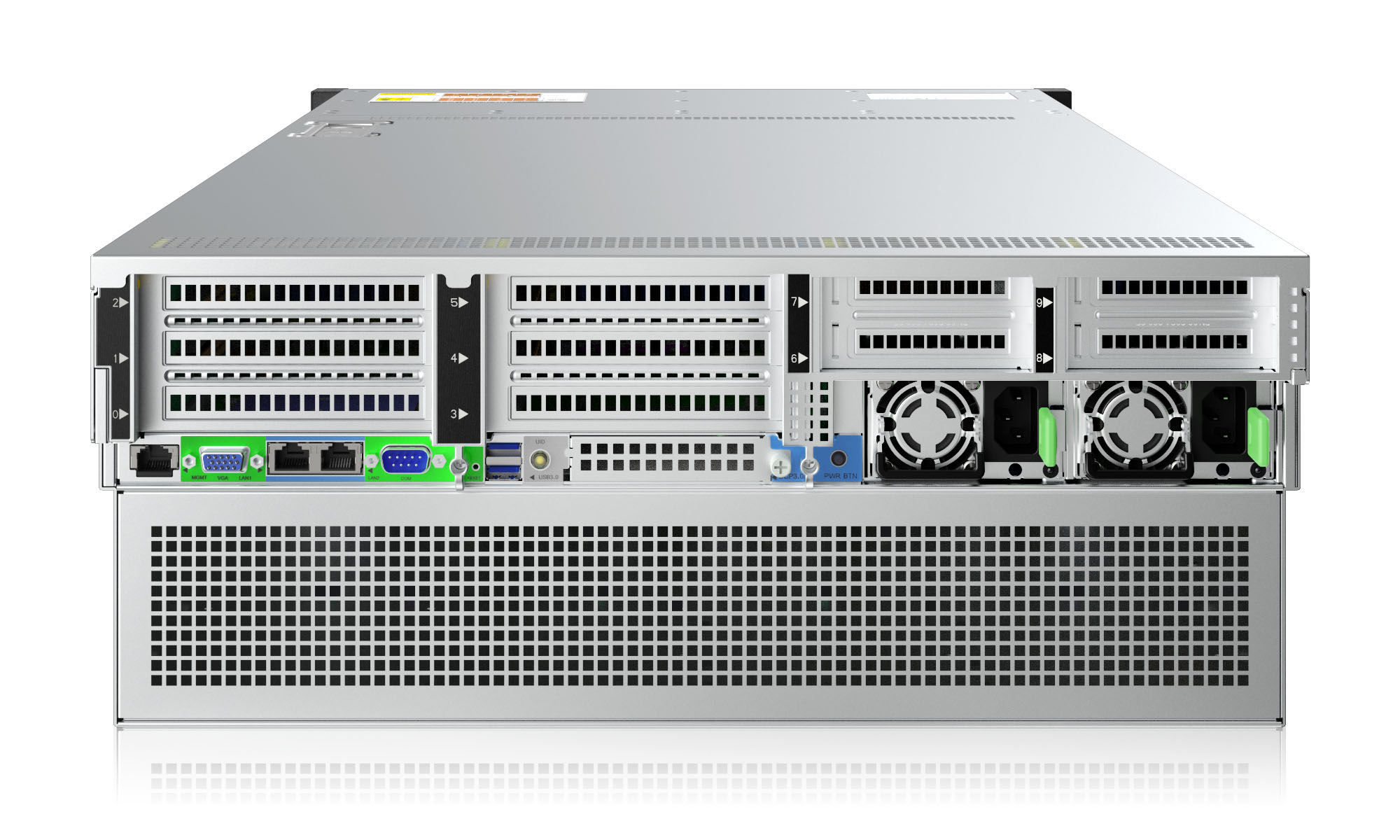 硬盘、电源、风扇全模块化设计,PCIe位置可与磁盘互换,尾部PCIe位可更换为4个3.5″ 和4个2.5″ 硬盘或8个2.5″ 硬盘;